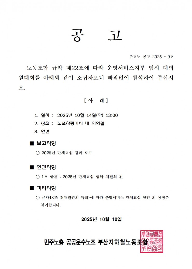 7월 3일(목), 10시 30분 부산시청 앞 광장에서 '2025년 단체교섭 승리를 위한 조합원 결의대회'를 진행하였다.폭염의 고통 속에서도 약 1000여 명의 조합원들이 모여 강인한 의지와 결의를 부산시와 사측에 보여주었다. 합의사항 이행을 …