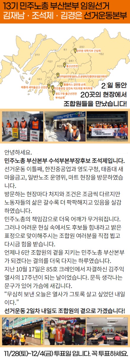13기 민주노총 부산본부 김재남-조석제-김경은 선거운동본부 2일차 선거운동 보고