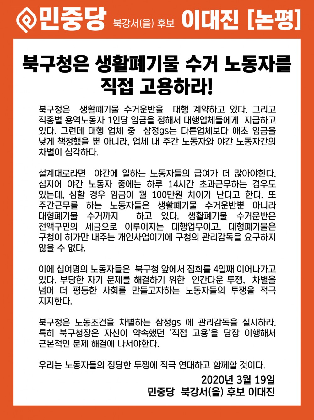 [민중당 북강서을 후보 이대진 논평]북구청은 생활폐기물 수거 노동자를 직접 고용하라!